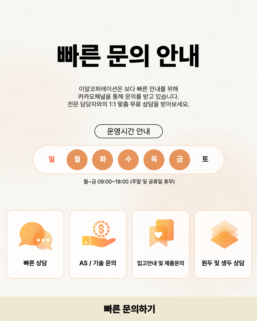 📢 빠르고 정확한 상담이 필요하신가요? 이알코퍼레이션은 카카오채널을 통해 전문 상담을 운영하고 있습니다. 각 분야 담당 전문가가 1:1 맞춤 무료 상담을 도와드립니다. 보다 빠른 안내를 원하신다면 카카오채널을 이용해주세요. ⏰ 월–금 09:00–18:00